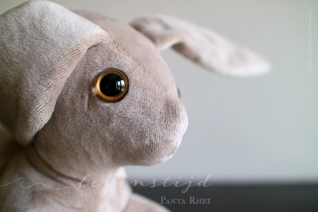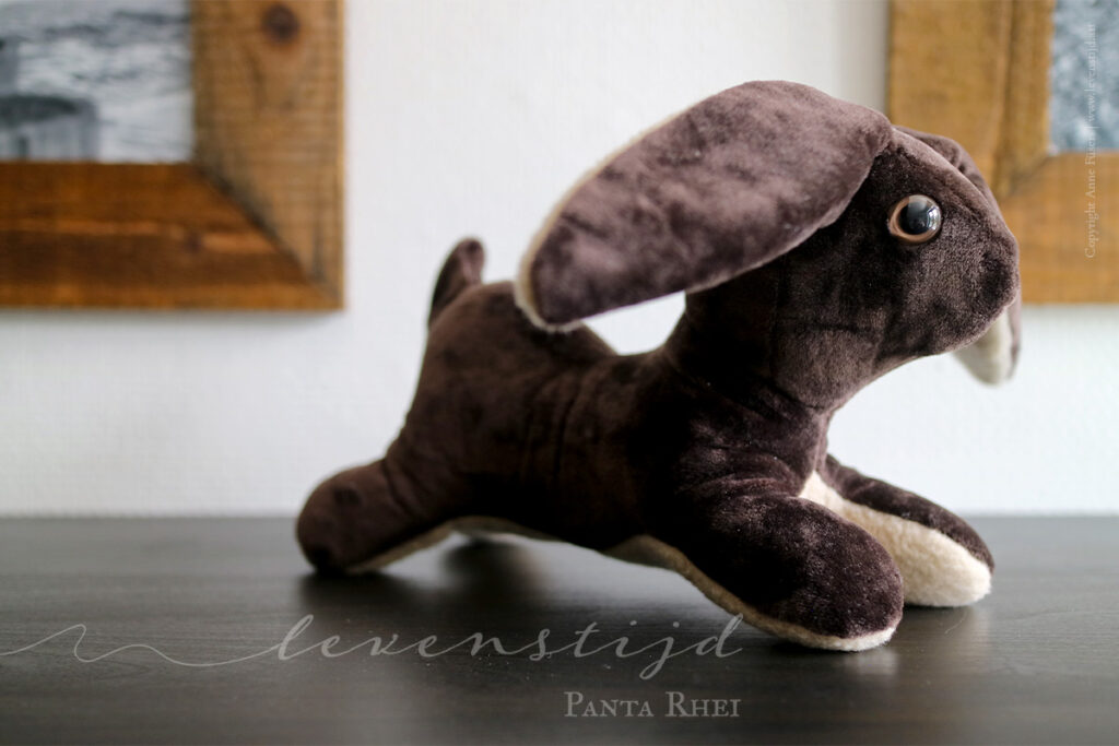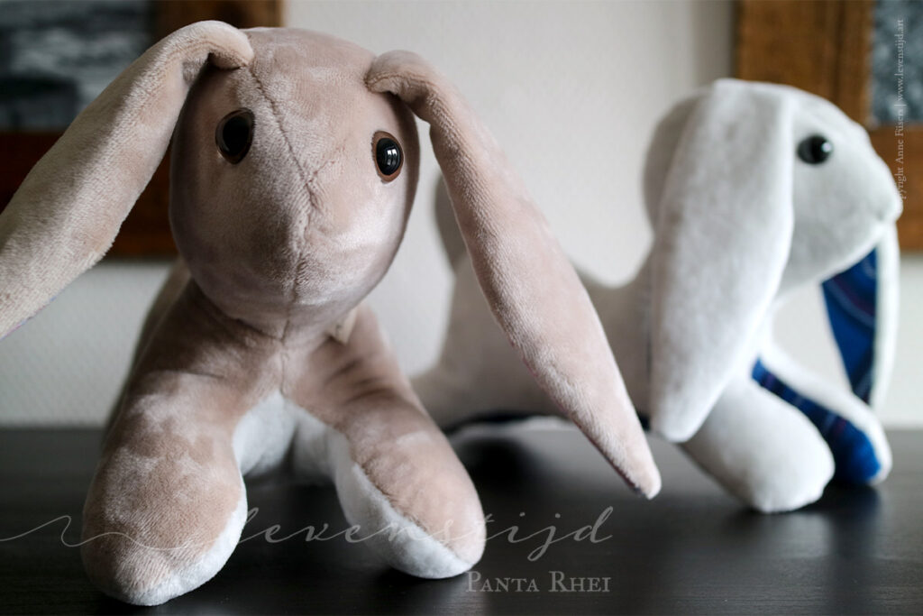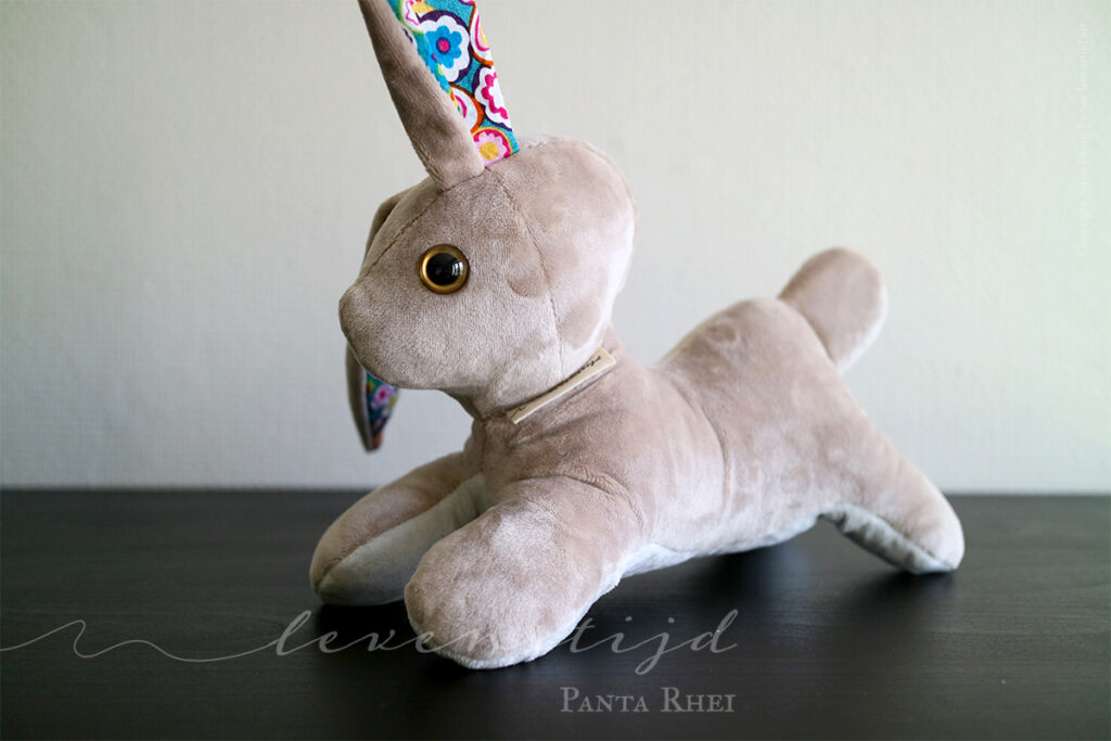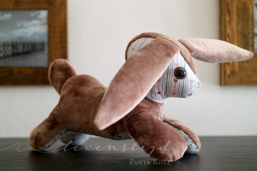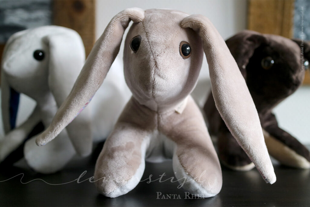 Dieses Kaninchen wird etwa 15 cm hoch. Die langen Schlappohren schreien geradezu nach einem Kontraststoff! Aber auch Bauch oder Schwänzchen können gerne in einer anderen Farbe gestaltet werden.